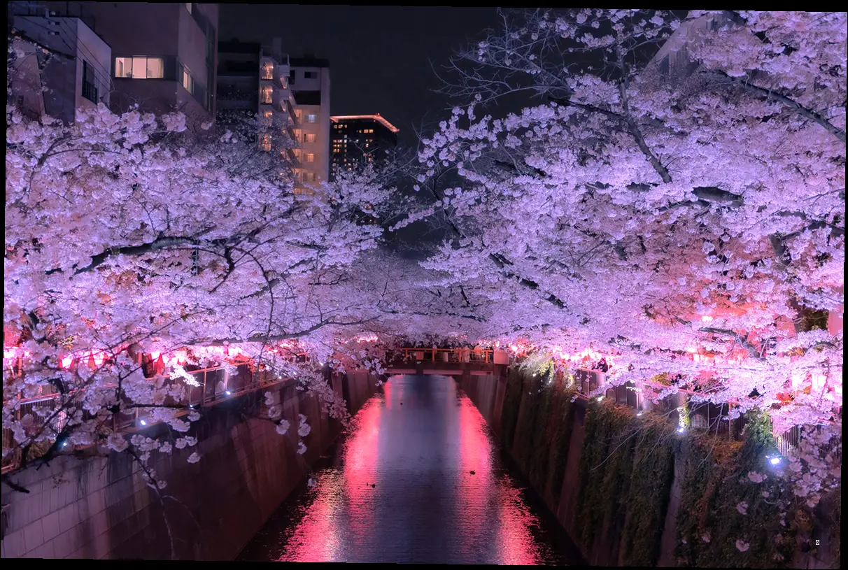 해 질 녘, 벚꽃과 조명이 만들어내는 환상의 하모니